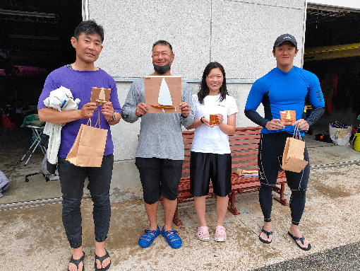 振れと強弱の大きい西よりの風の中、ブローとシフトを上手く掴んだ艇が上位を走っている印象でした。優勝は新規入会の大成選手、2位には安定感のある中尾選手、3位には最近実力をつけてきている竹内選手が入りました。おめでとうございます。賞品として今月のスポンサー大浦様より素晴らしい盾が贈呈されました。ありがとうございます。